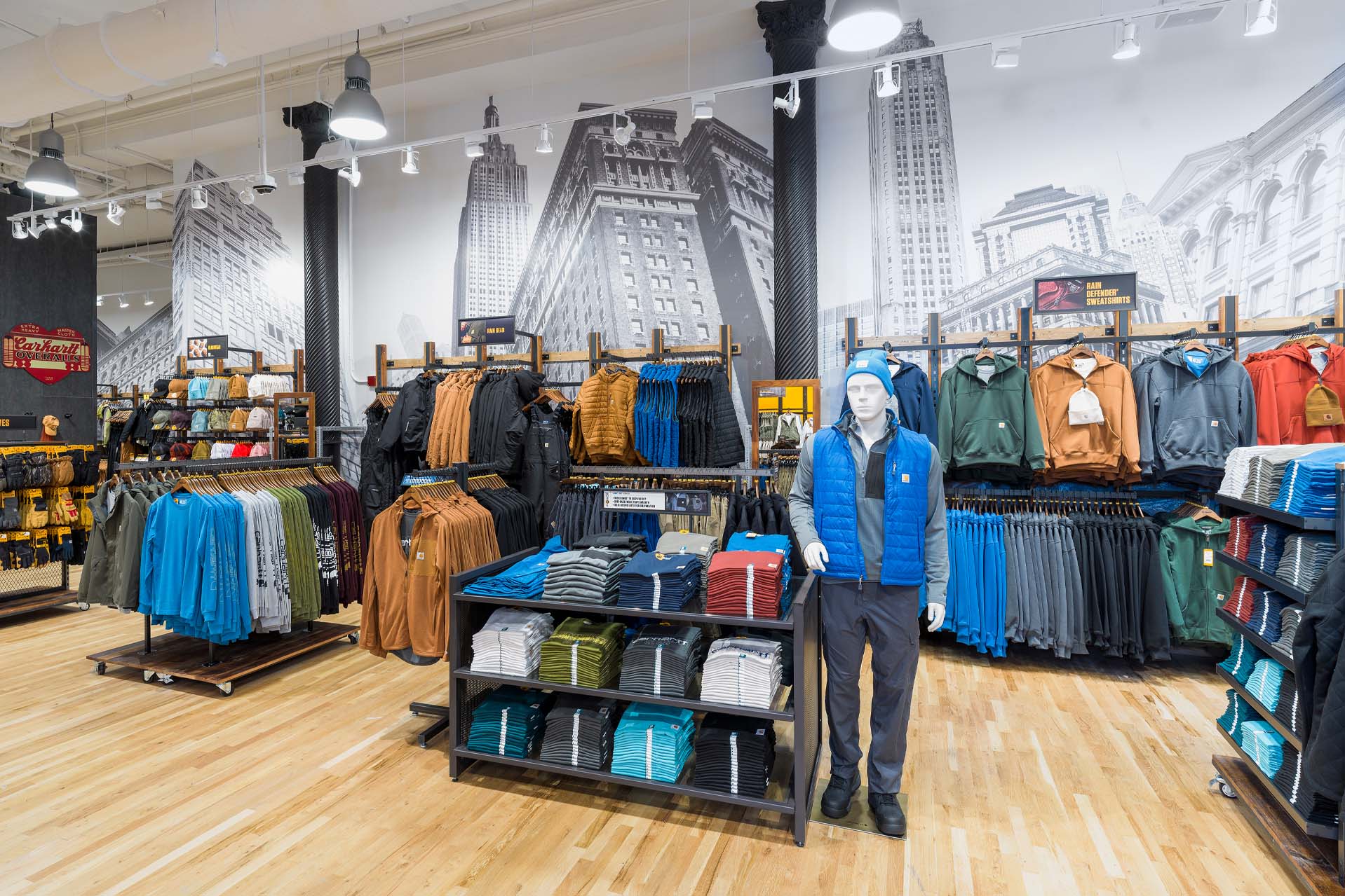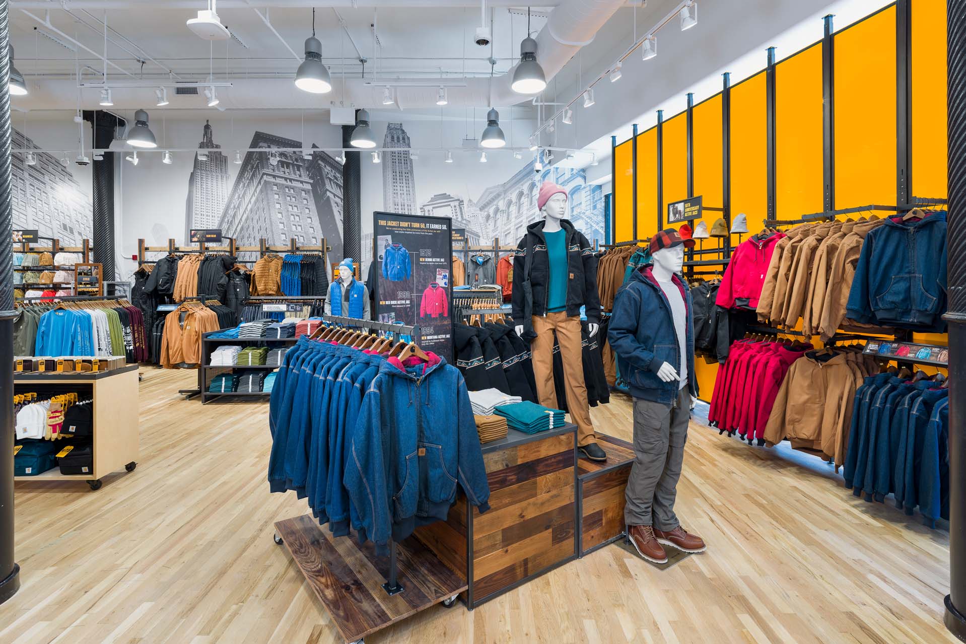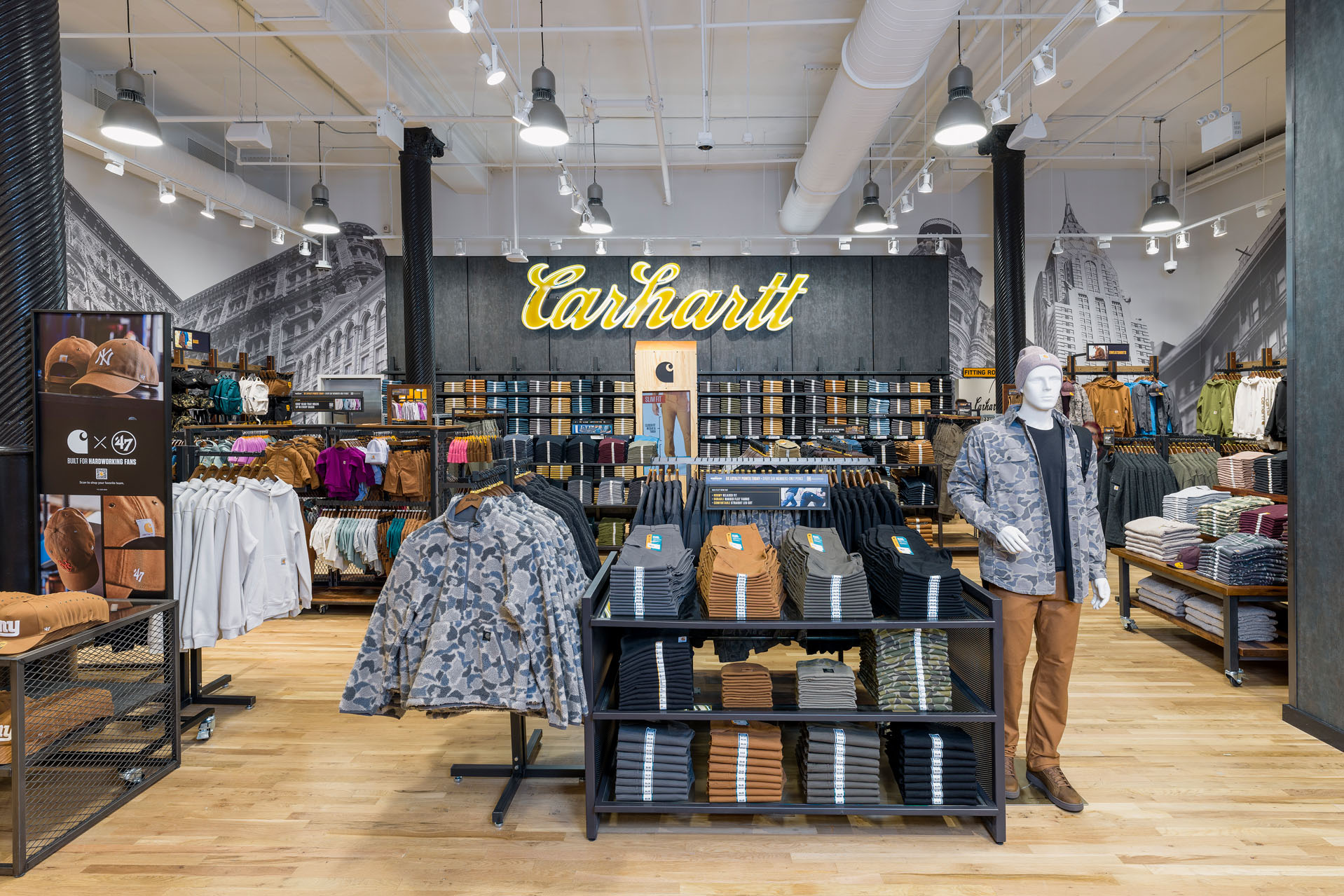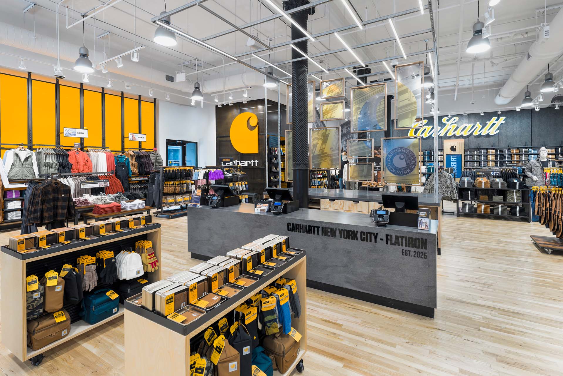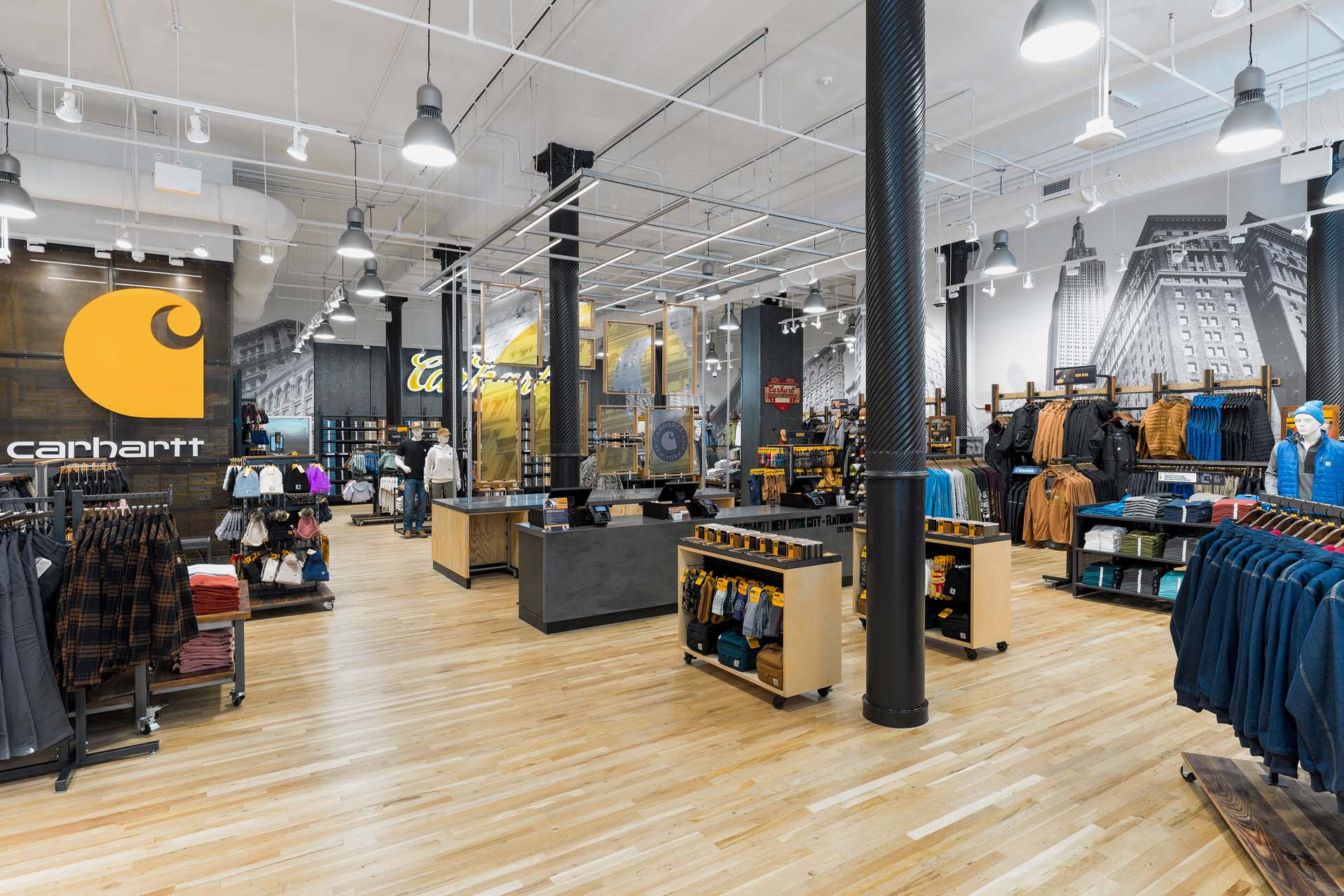At the corner of Broadway and 22nd Street in the Flatiron District, Carhartt’s undeniable iconic, yellow logomark on storefront cements its establishment in the community while a sense of pride builds inside with the black & white NYC buildings’ mural celebrating the local community this store serves.