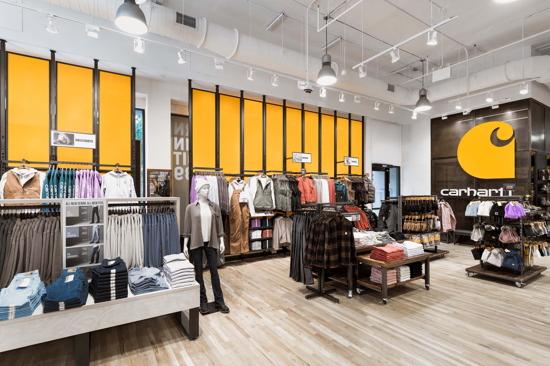 In keeping with Carhartt’s heritage of workwear, the overall feel of the space has a rugged quality. Elements of construction such as plywood and steel are fused into the design to bring a familiar/casual environment that speaks to the life settings in which the Carhartt products are used. The iconic Carhartt yellow is used on the interior to accentuate the windows as well product displays creating a bold merchandising statement.