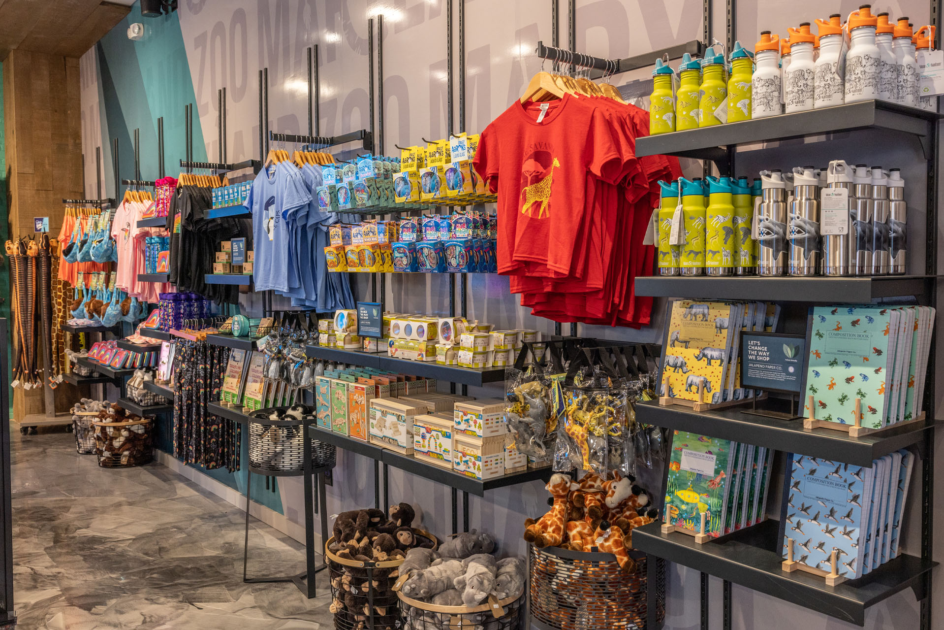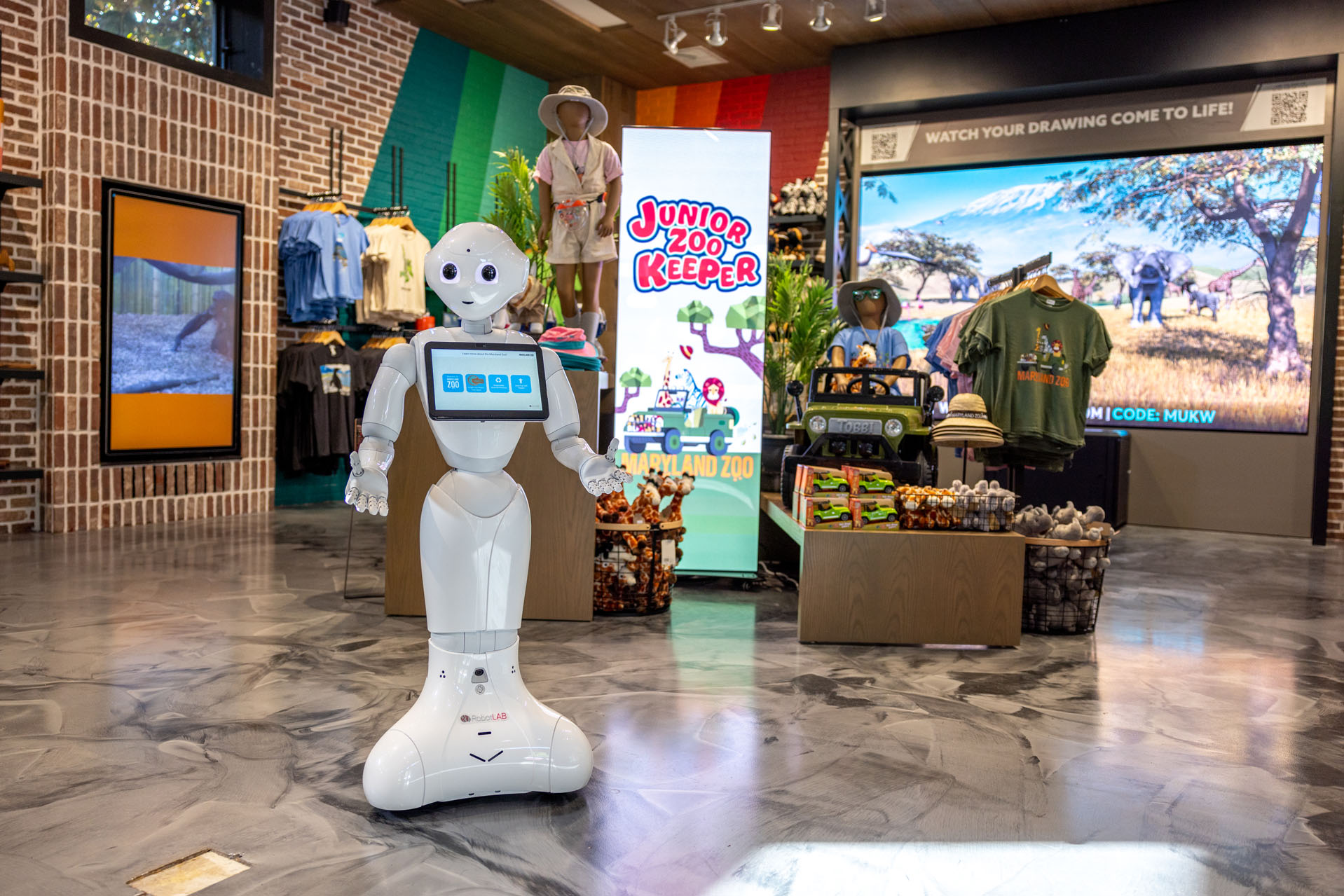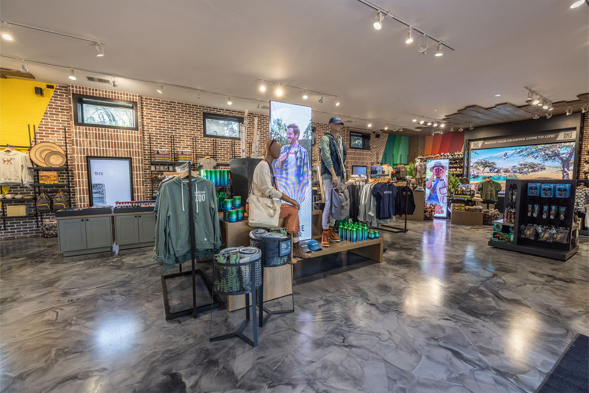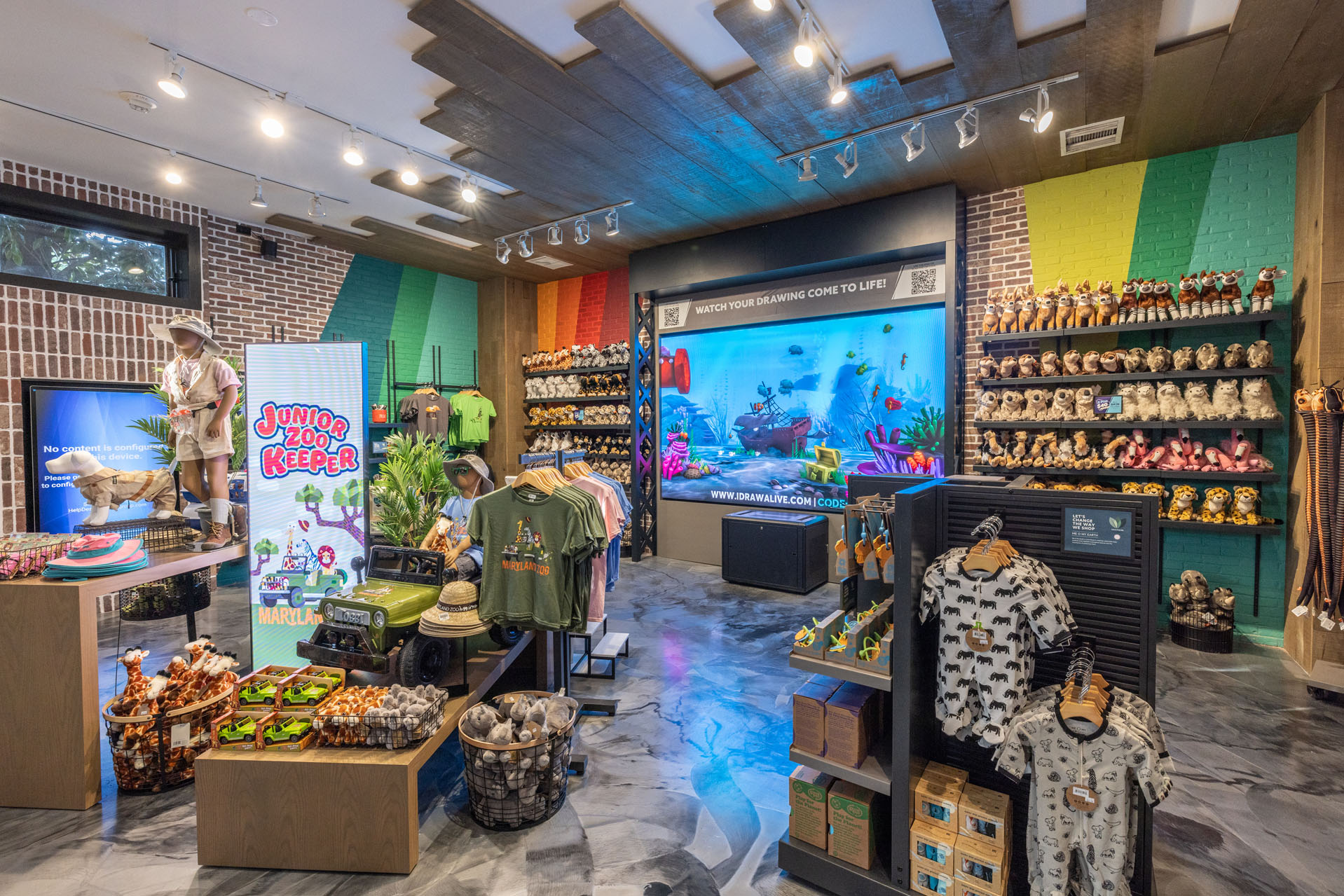 Upon entry, you are immediately greeted with bold colors. The contrast between the exposed brick walls, along with the bright, eye-popping Maryland Zoo logo mural allow for a complimentary juxtaposition that engages customers and sets the mood. Custom fixturing, signage, and accessories were all designed and selected to complement the surrounding architecture in form, proportion and detailing. This attention to detail creates a cohesive experience and backdrop for the unique merchandising and product collections. Inspired as a subtle nod to Baltimore’s connection to the water and harbor, wood planking on the ceiling frames the focal points of the space above the cash wrap and digital wall. Ironwork details within the shop take inspiration from the iconic Chesapeake Bay Bridge, furthering the connection of the Baltimore harbor and water to the space. The integration of an interactive experience that combines physical and virtual elements serves to educate and engage guests. Children and adults can watch their drawing come to life on the big screen, making the shop a destination within the park, inspiring creativity while also increasing dwell time and interaction inside the shop. The introduction of “Pepper” the friendly robot, whose cutting-edge technology is built to connect with customers, further enhances the shopping experience assisting customers, and sharing conservation and product knowledge.